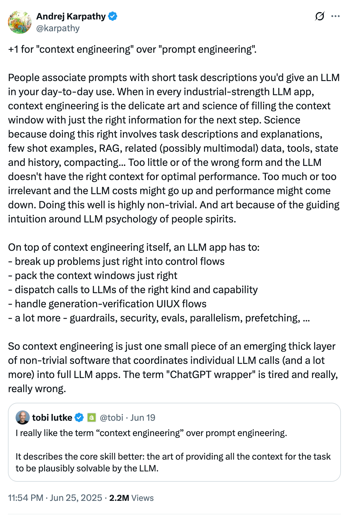 上下文工程(Context Engineering)这个名词并不新,但是在今年以来持续获得关注,尤其是当Karpathy在2025年6月25日引用了Shopify CEO Tobi Lutke那条推文,并发表了简洁但深刻的推文之后,全行业开始认真对待上下文工程这个概念、艺术、实践,或者甚至可以说是一个学科。