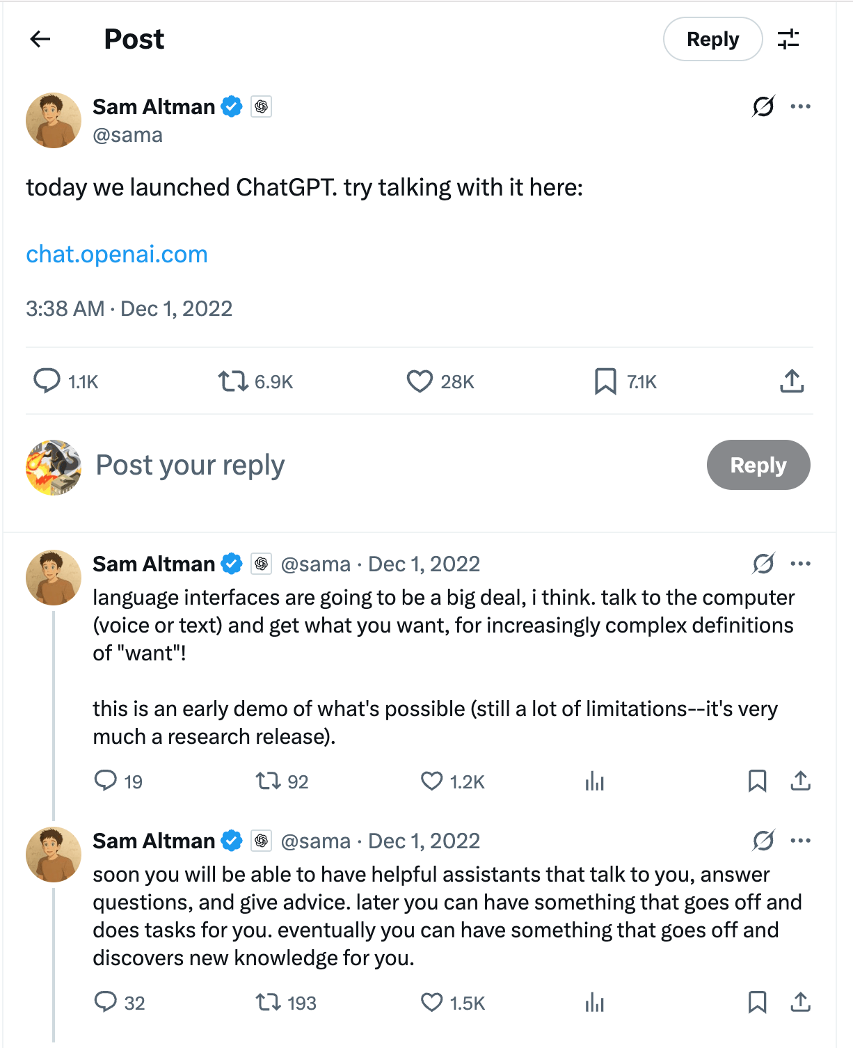 上面这个是OpenAI的CEO Sam Altman在2022年12月发的一条推文,预示着ChatGPT正式走上历史的舞台。在那之后,ChatGPT在5天内就达到了百万个用户
