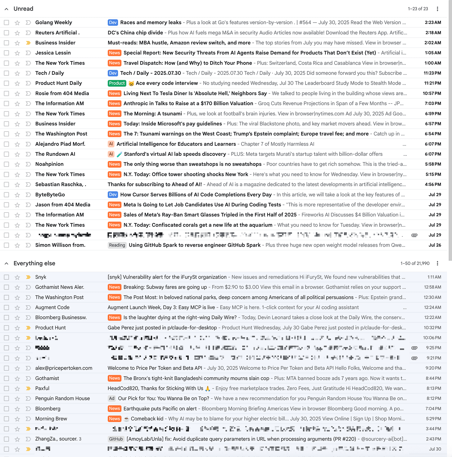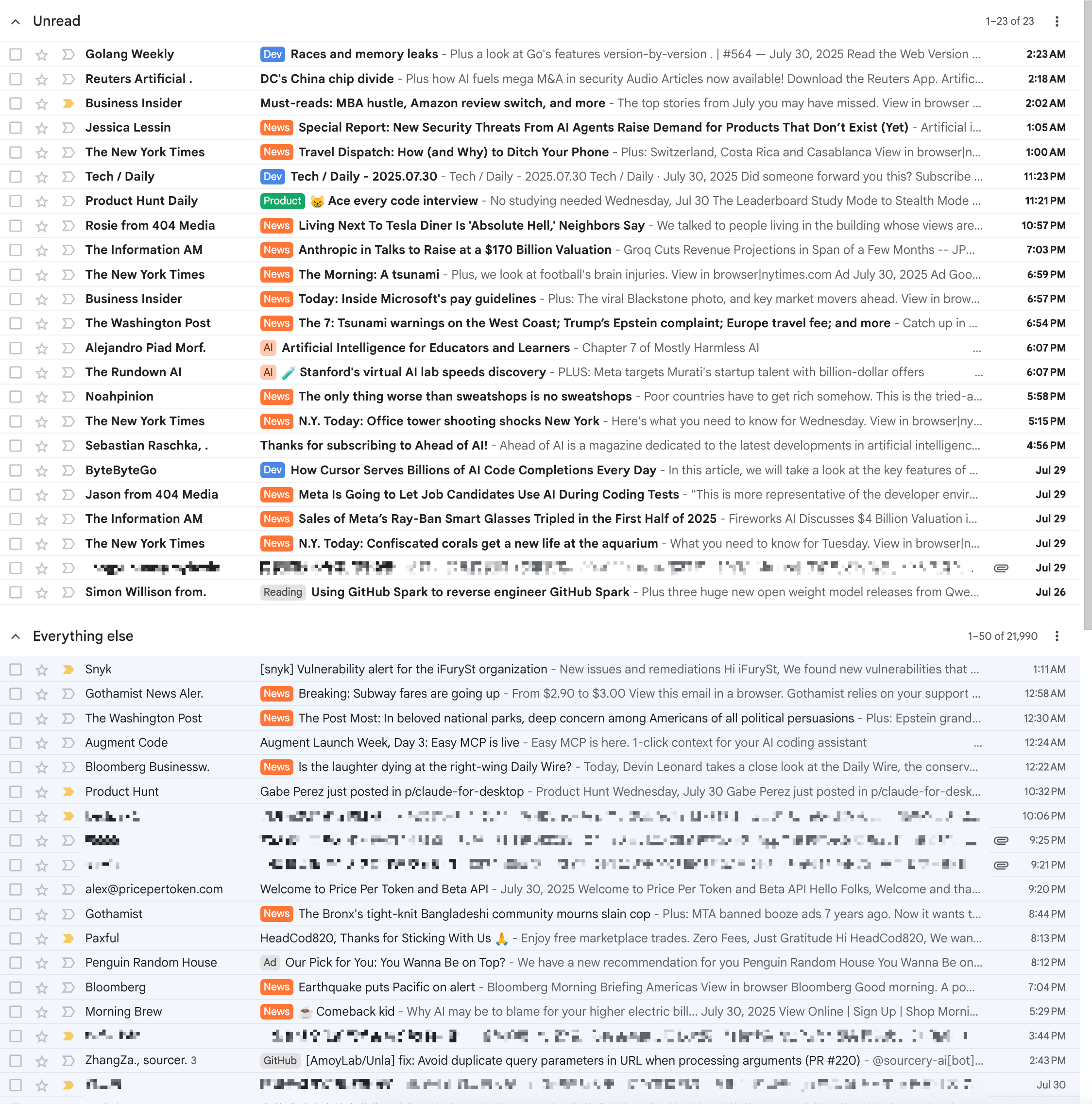 我随手截个图,基本上每天下午18点开始,西方世界就开始苏醒了,知道早上我醒了,他们开始睡去了,因此每天早上都有几十+的Newsletter在等着我,我每一天都是在Catch up的过程中度过的,但是不是一开始就这么多的。一开始只有几条,相当吃力,但是每当我的阅读能力提升了,能适应这个量级之后,我就会继续去订阅更多的Newsletter,通过一次又一次的提升,现在平均一天我可以解决近百的Newsletter。这就是暴虐自己的阅读能力的结果。