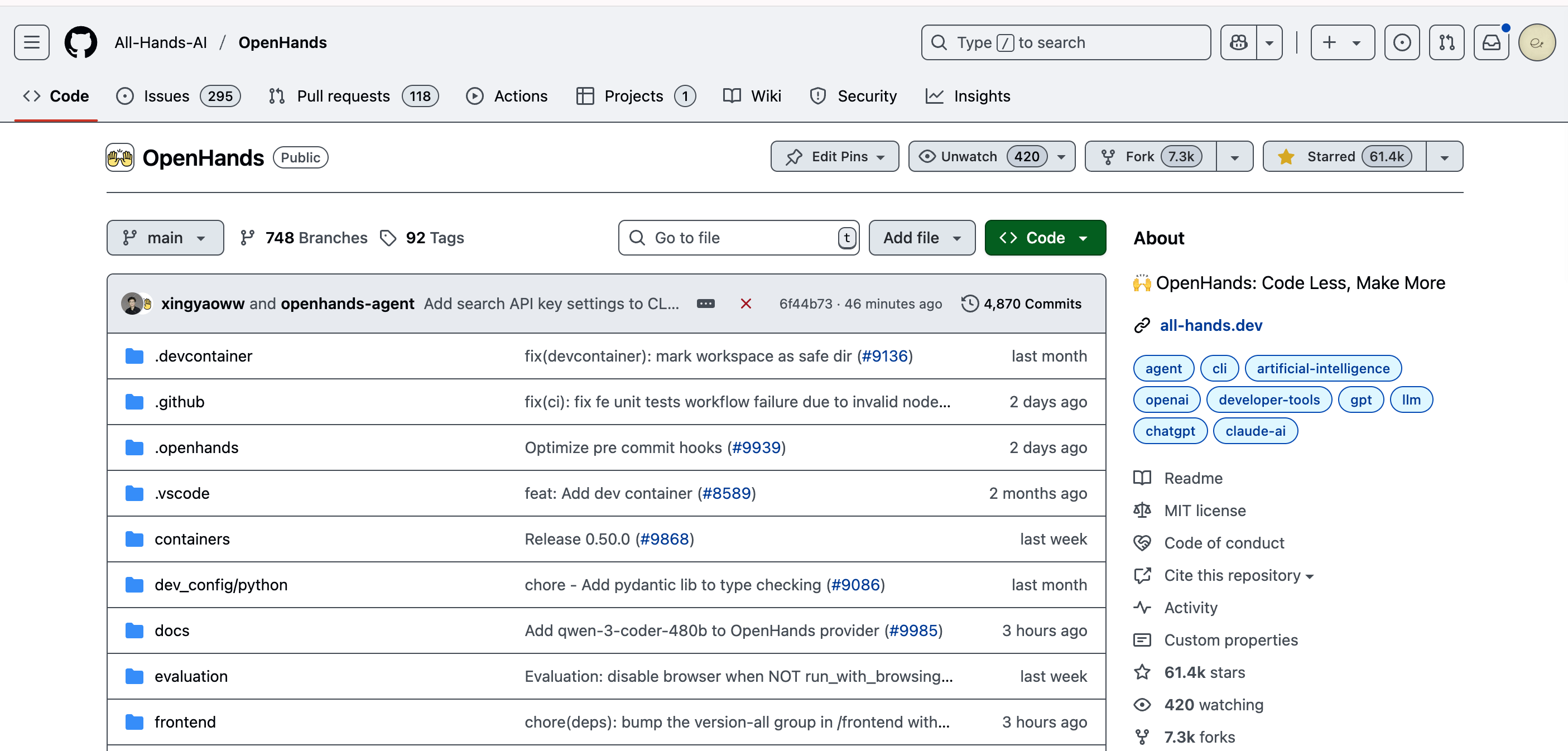 一切还要从24年5月份说起,当时Devin刚出来,千问的人就在GitHub上开了一个叫OpenDevin(现在改名叫OpenHands)的仓库,我在因缘际会的情况之下,成为最早期的一批贡献者,也顺利成为维护者之一