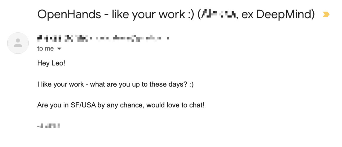 随着我在开源社区的持续投入,开始陆续有人找上我,小到一个想找我闲聊的人,大到远在硅谷的企业,甚至DeepMind的大佬都叫我下次去硅谷一定要告诉他,想和我聊一下。我也尝试了全程英文进行面试,虽然结果惨不忍睹,但是我依然勇敢的接受邀约,哪怕只是15分钟的small talk。