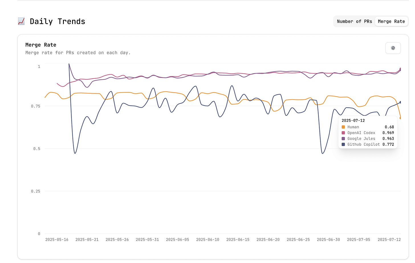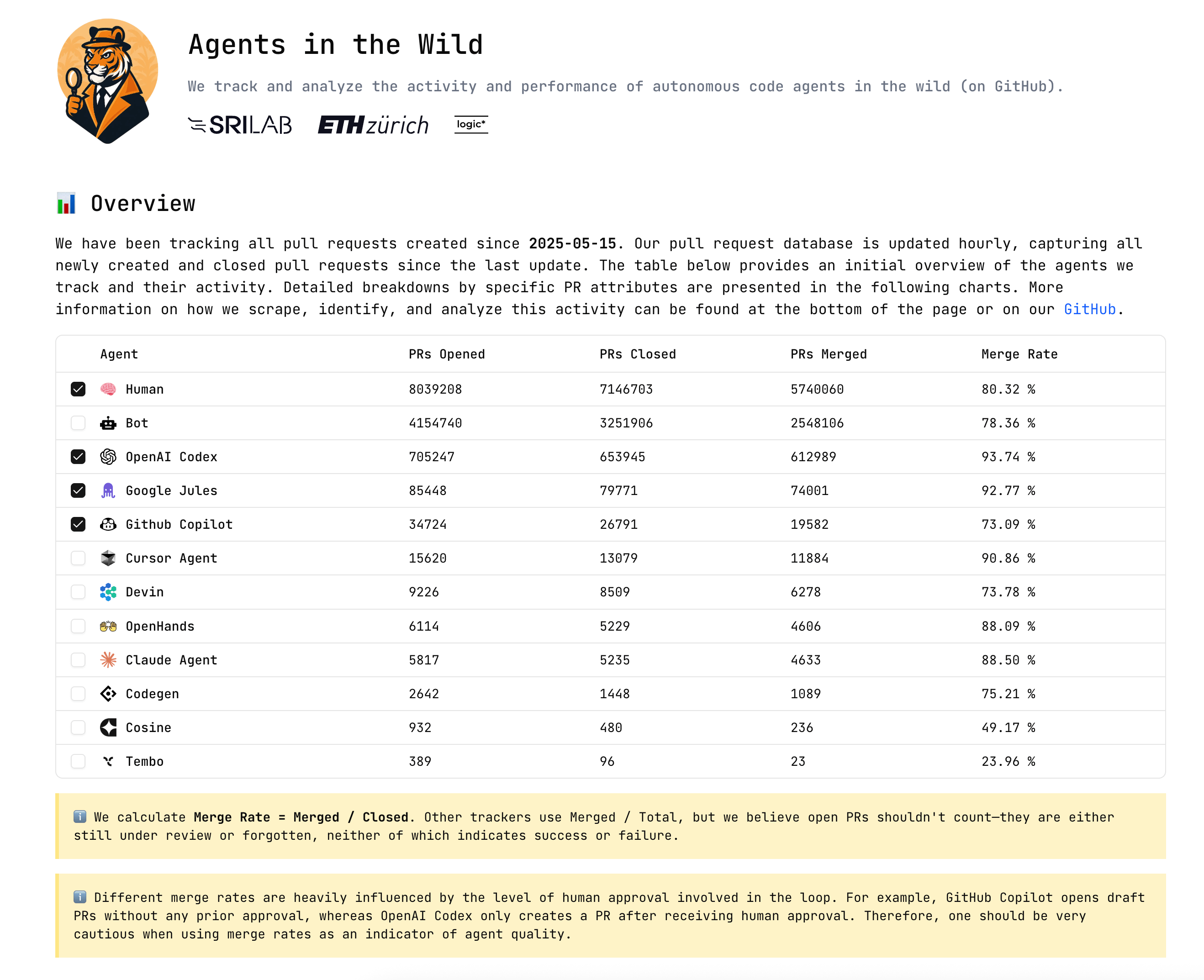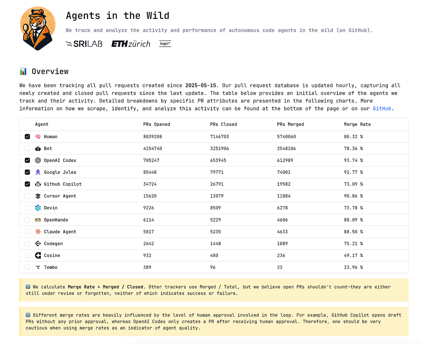 自 2025-05-15 起,一个叫 Agents in the Wild 的项目开始持续追踪 AI Agent 与人类开发者提交 PR 的情况。